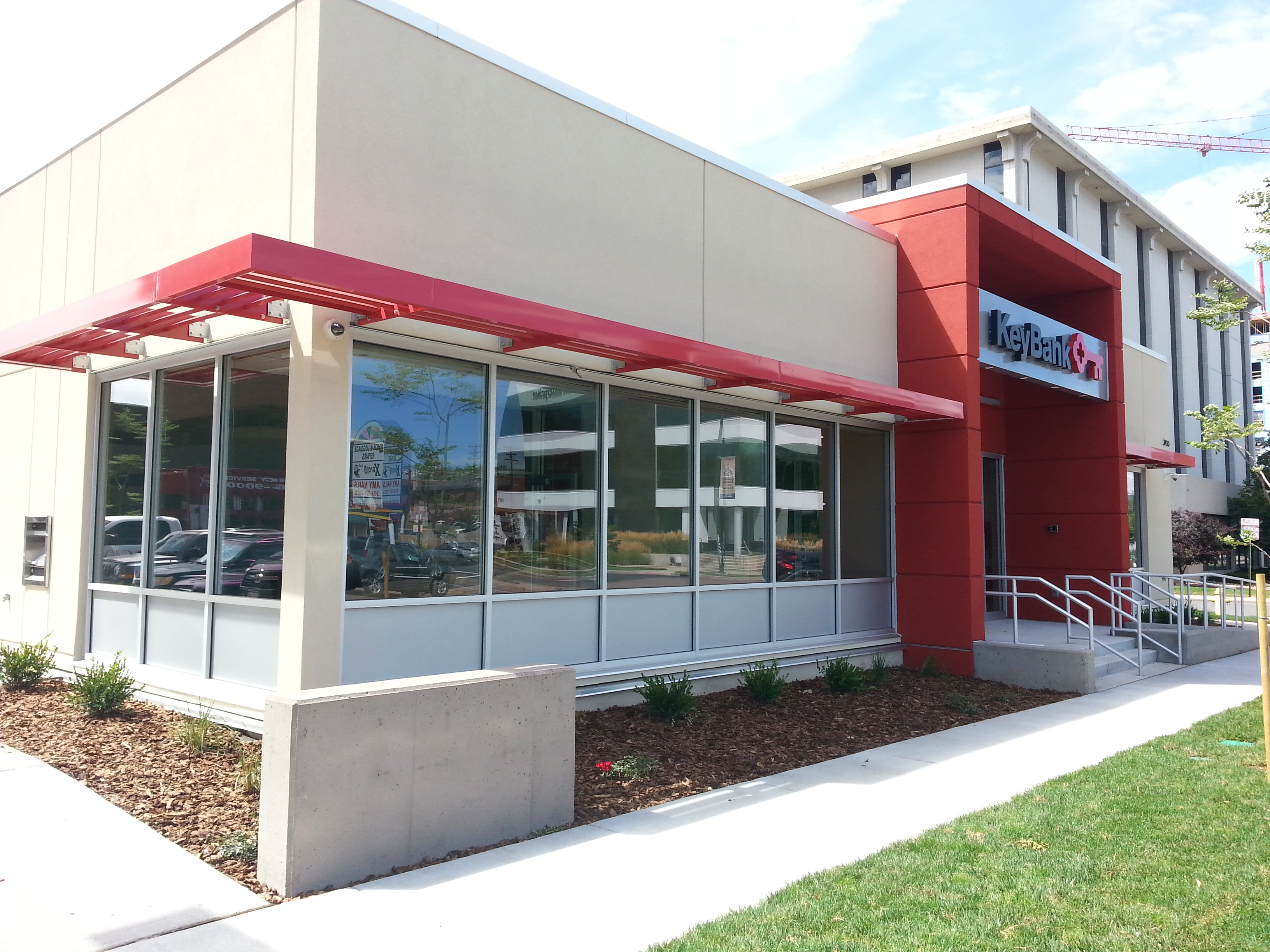 Custom aluminum sunshades, stair and ramp rails at Key Bank, Cherry Creek, CO.