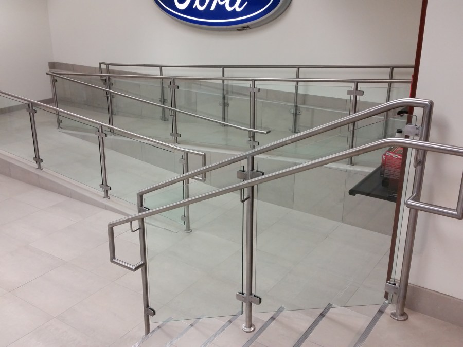 S/S ramp and stair rails with glass panels at a local FORD Dealership